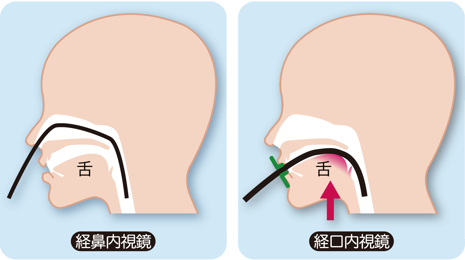 経鼻内視鏡検査とは、口ではなく鼻から極細の内視鏡スコープを挿入する検査方法です。鼻から挿入するため、スコープが舌の奥に触れる心配がなく、胃内視鏡検査の特徴である嘔吐反射を起こしにくいというメリットがあります。